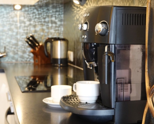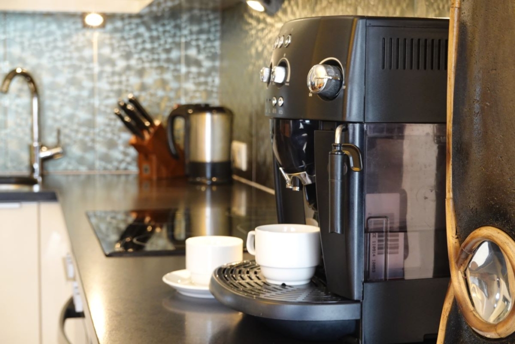 Kitchen with refrigerator, dishwasher, oven, coffee maker,